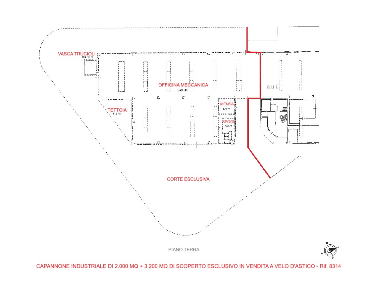 L'immobile è caratterizzato da grandi spazi interni open-space con pavimentazione industriale resistente al traffico pesante e numerose finestre che garantiscono un'eccellente luminosità naturale durante tutto il giorno grazie anche ai lucernari sul tetto. L'altezza interna di 9,90 mt permette l'utilizzo di macchinari ingombranti o la realizzazione di scaffalature verticali per lo stoccaggio merce.